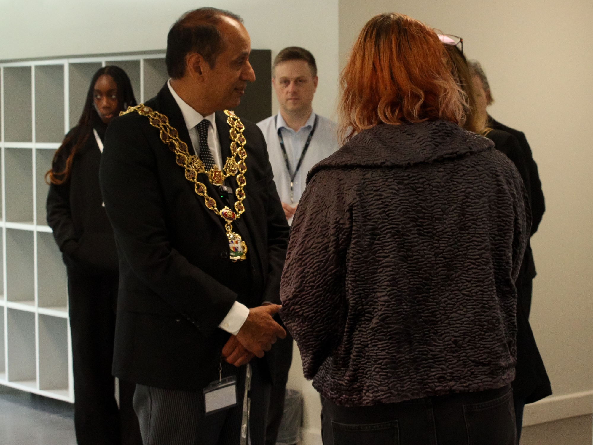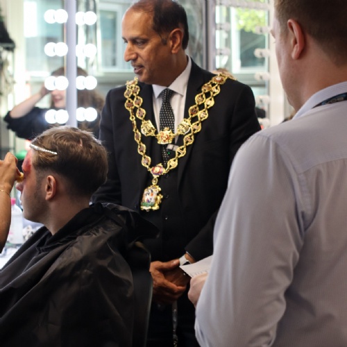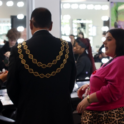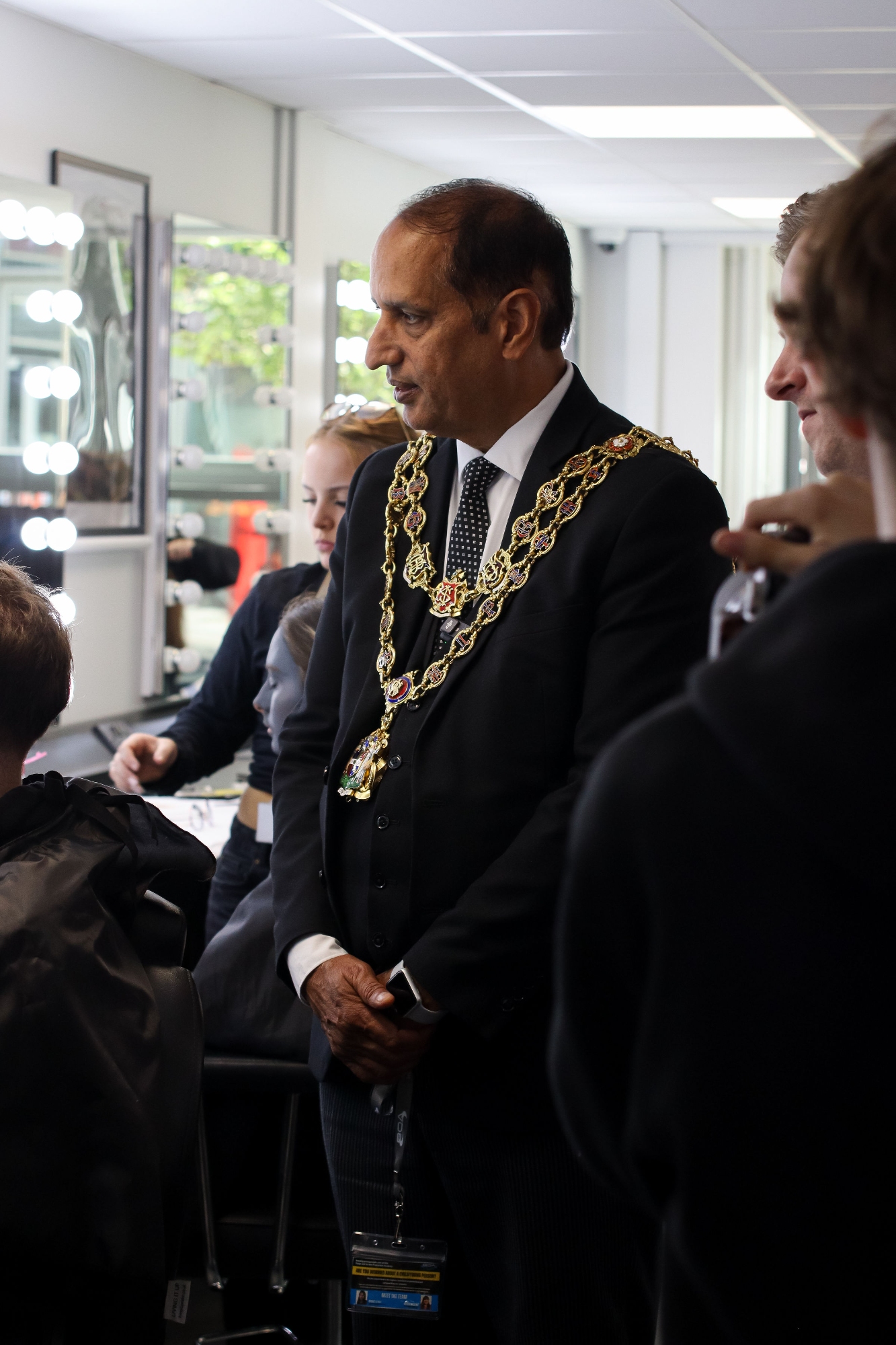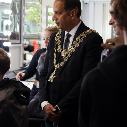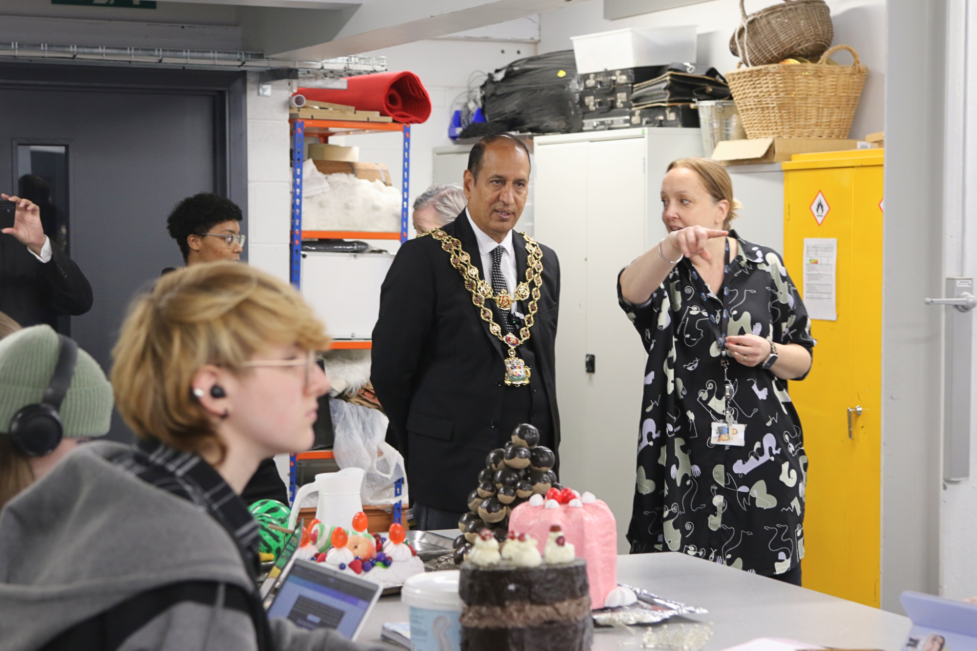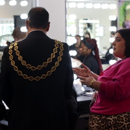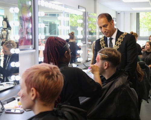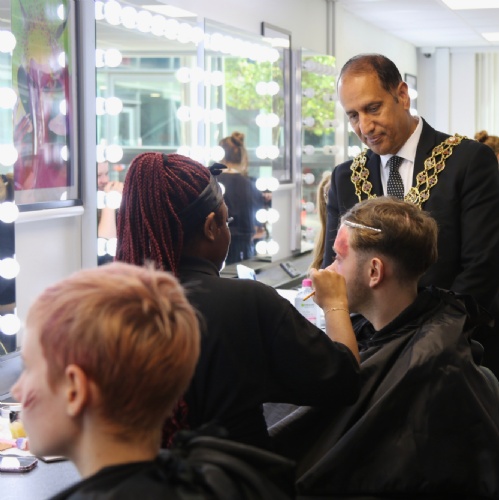 During the tour, the Lord Mayor enjoyed an immersive behind-the-scenes journey through the Academy’s specialist departments. In the TV & Film department, he watched a live filming of student-led interviews and the fast-paced editing process from the gallery. In Hair & Make-Up, he saw students transform into goblins as well as master intricate 1960s beehives. The Lighting & Sound department impressed with an exciting light show, while Set, Props & Costume showcased their stunning progress on costumes and designs for Cinderella, which will be staged at The Old Rep this Winter. Meanwhile, Writing, Directing and Screen Craft students captivated visitors with a session of live improvisation, highlighting the Academy’s focus on collaboration and creativity across all disciplines.